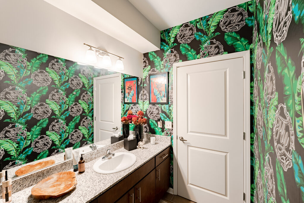 But the guest bathroom is where Jordan really shows off. Covered in her bold Bamboo Paradise wallpaper, the cozy space makes a big statement and holds special significance: It was where Jordan first tested her product on her own walls. It’s become a conversation starter, a bold declaration in an otherwise ordinary apartment space.