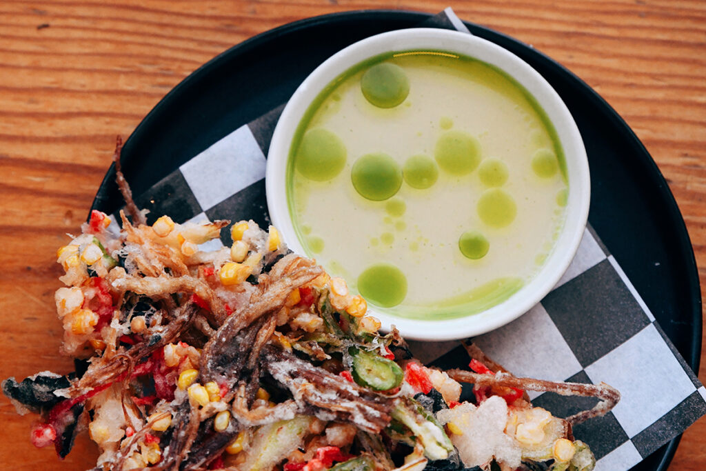 There are three dishes you must order. First: the skewered meats—fatty chicken tails and hearts and tender chicken oysters mostly sourced from Barham Family Farm in Kearney. Second: the tempura fritters of black tiger prawns, mushrooms, corn, leeks, shishito peppers and pickled red ginger. They’re incredible. “Rip it and dip it,” Chang said as he handed me the plate. Eat it with your hands and drag each piece through the bright tentsuyu dipping sauce. Third: the fried and breaded pork collar sandwich. On a return visit, the pork was subbed with tiger prawns, which was good but no match for the original—gloriously juicy fried pork nestled between white miso egg salad and crunchy Taiwanese shredded cabbage.