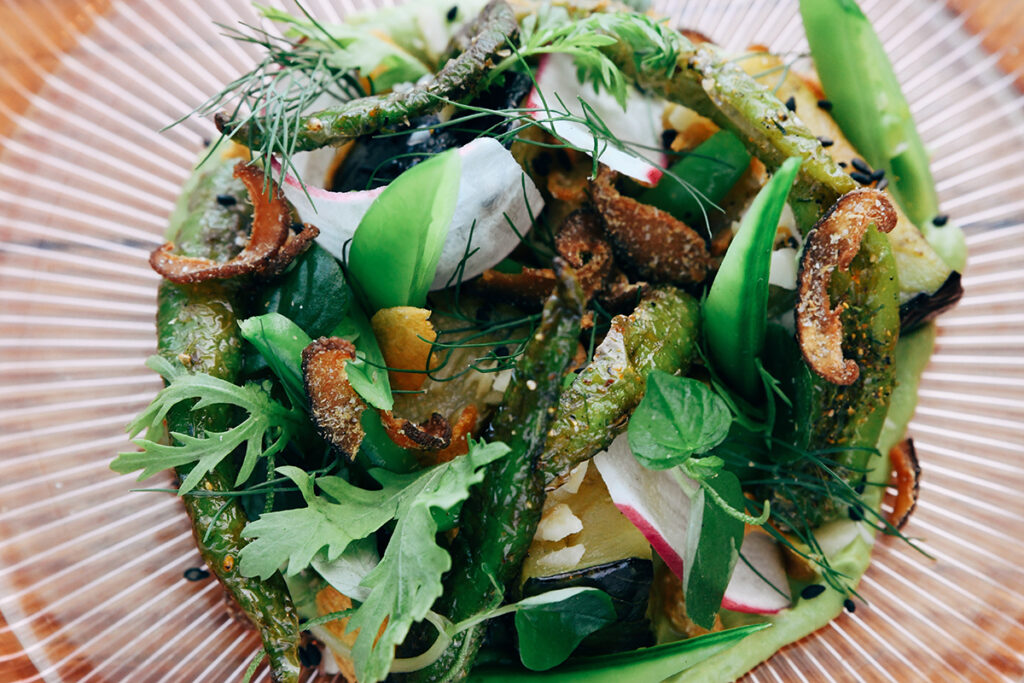 The cabbage salad was one of the most interesting dishes I’ve had in recent memory: a chaotic mix of mint, fried sardines, Ginko nuts and glassy shards of caramel (a byproduct from the nuts). I took bite after bite just to understand it. The salad’s bounty of textures is one of chef Goellner’s signatures and often seen at the Antler Room. That said, the marinated eggplant salad with blistered shishito peppers, fried shiitake mushrooms and an avocado-sansho pepper purée holds its own.